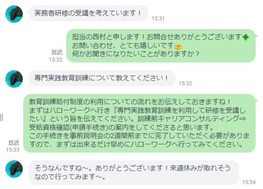 ↑実際のLINEのやりとりの様子。お一人おひとりの状況に合わせて担当者が丁寧にご案内しますよ!